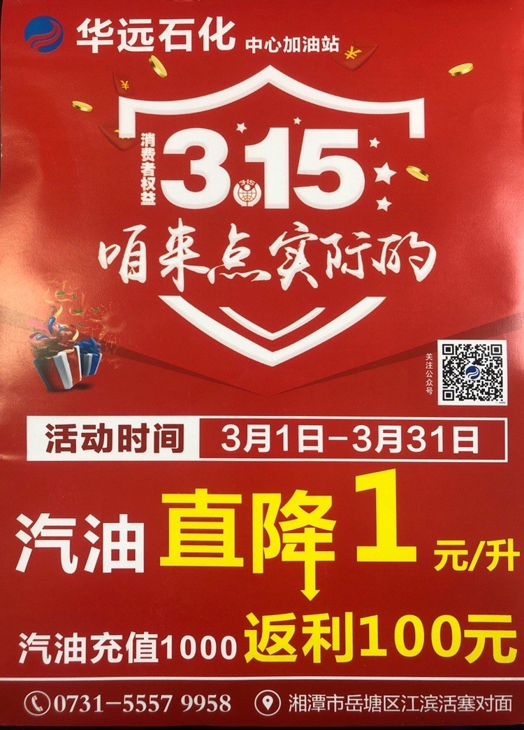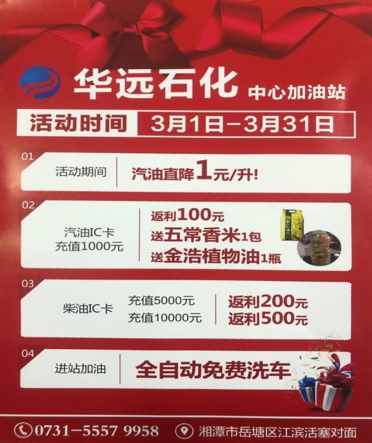 2020年3月疫情得到控制以后,湖南華遠(yuǎn)石化有限公司響應(yīng)政府號召,支持湘潭市各企業(yè)開展復(fù)工復(fù)產(chǎn)工作,在湘潭市中心加油站率先推出油品單價(jià)掛牌價(jià)直降1元的優(yōu)惠活動(dòng),讓利社會,回報(bào)大眾。另外持華遠(yuǎn)石化加油卡充值優(yōu)惠返利10%,活動(dòng)時(shí)間3月份,長達(dá)一個(gè)月,此外充值還贈送東北五常大米,金浩茶油等基本生活物資。